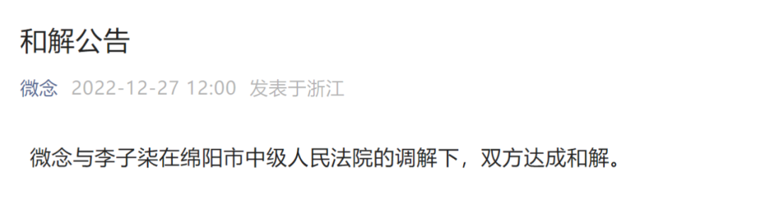 2022年12月27日,杭州微念品牌管理有限公司在其公眾號(hào)發(fā)布和解公告,聲稱微念與李子柒在綿陽市中級(jí)人民法院的調(diào)解下,雙方達(dá)成和解。據(jù)國(guó)家企業(yè)信用信息公示系統(tǒng)顯示,12月26日,李子柒(李佳佳)關(guān)聯(lián)公司四川子柒文化傳播有限公司發(fā)生工商變更,杭州微念品牌管理有限公司董事長(zhǎng)劉同明卸任四川子柒文化公司高管職位,同時(shí),股權(quán)由“李佳佳出資49萬人民幣;杭州微念科技有限公司出資51萬人民幣”變更為“李佳佳出資99萬人民幣;杭州微念品牌管理有限公司出資1萬人民幣”。目前,李子柒為該公司疑似實(shí)際控制人。